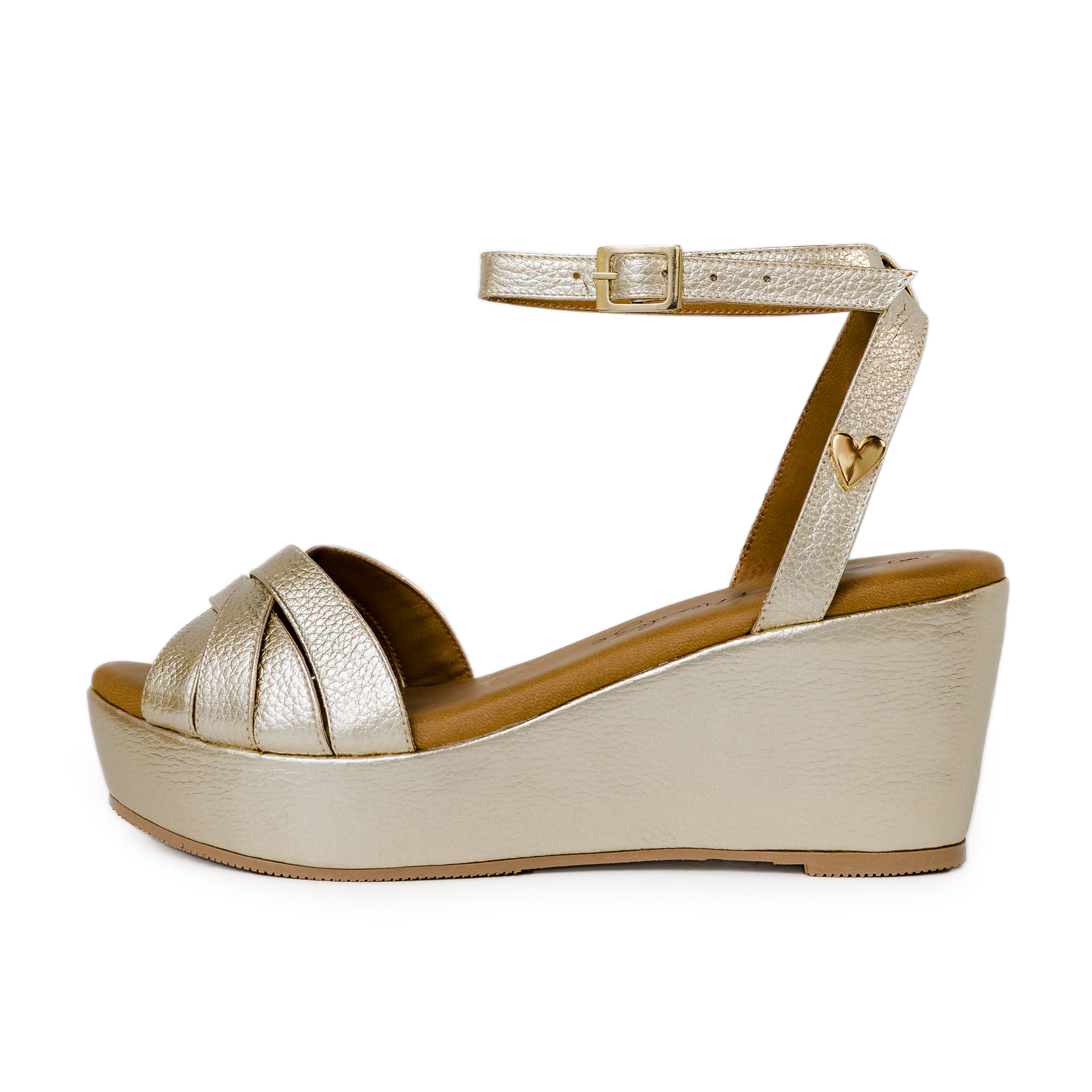 Designed to walk with you through every moment, Mercy blends a soft platform with an elegant, timeless silhouette. The crisscross gold leather straps and gold heart detail add a delicate, feminine touch—perfect for any occasion. Lightweight and supportive, this sandal keeps you comfortable all day long, without sacrificing height or charm.